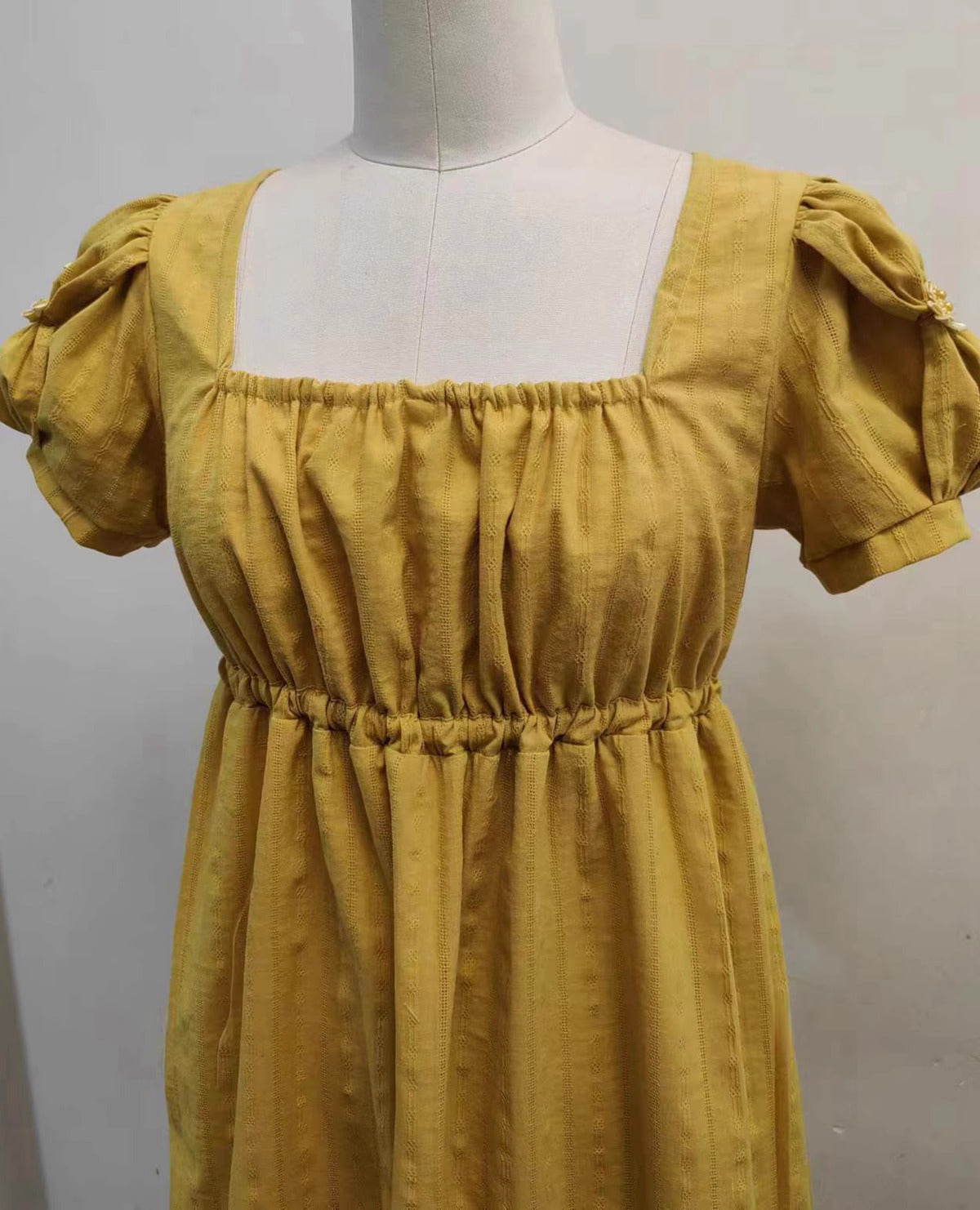 Unlike modern dresses,  the shoulder line of this historically inspired dress has been moved to the back, which is not a normal position. When wearing it, you need to first move the waist line to the position under the bust so that the front and back waist lines are almost at the same level. There are folds on the chest, which are elastic, The dress is adjustable, with high tolerance. After wearing, arrange the neckline folds to the middle of the chest appropriately, so that the shape of the dress is better. There are belt fixing lines on both sides of the waist, which can be inserted into the belt to prevent it from shifting and falling.