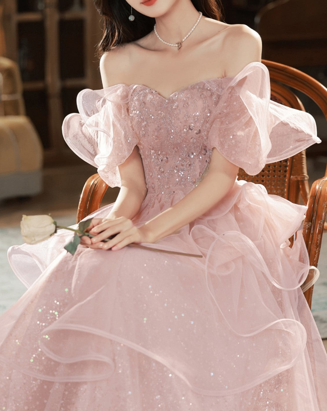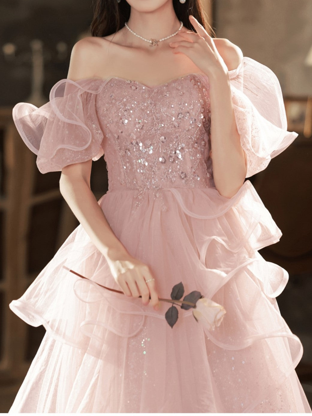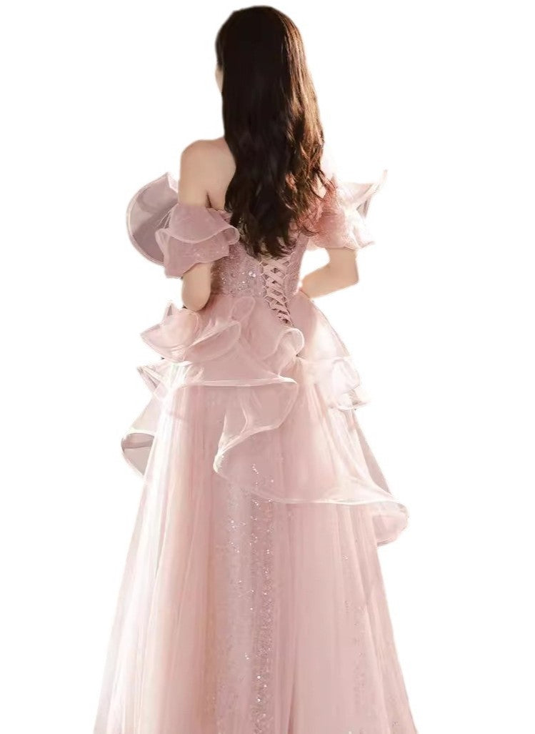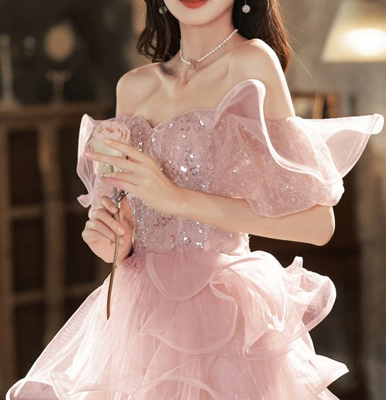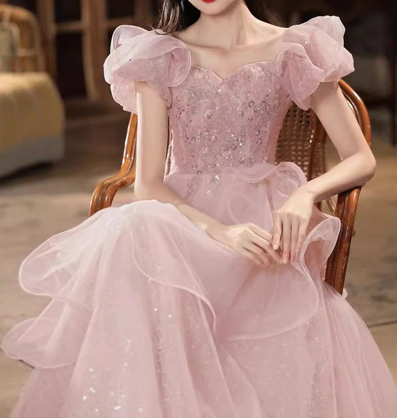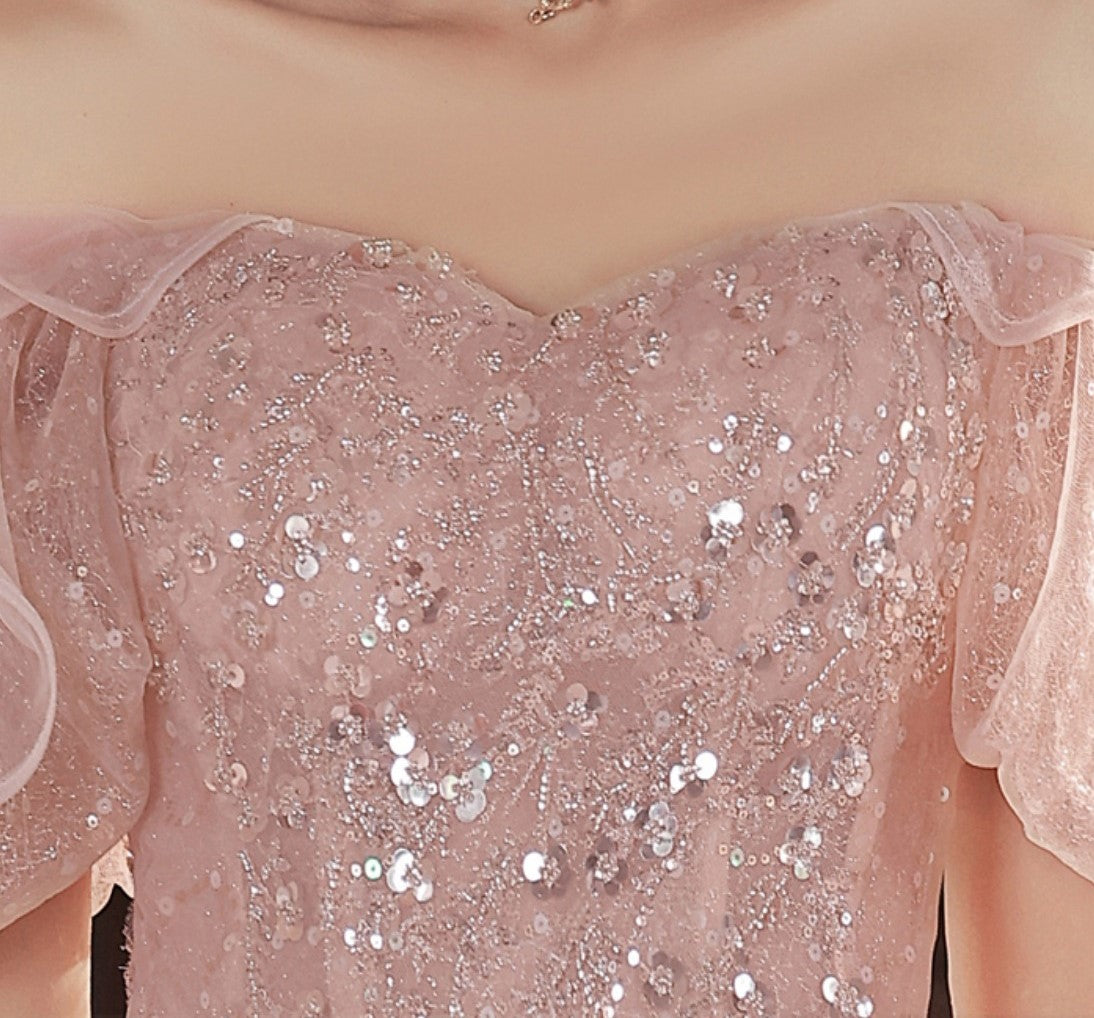 Pink Sequin Embellished Princess Prom Gown Elegant Evening Dress